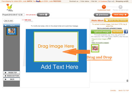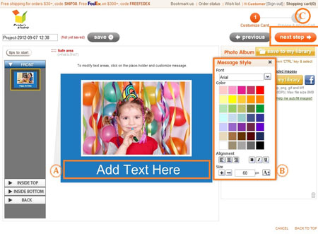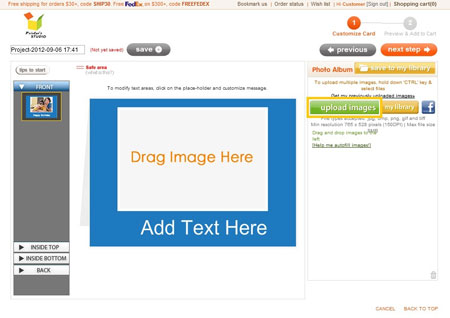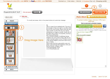 Click on tab INSIDE TOP, INSIDE BOTTOM or BACK at the left hand side panel to select which side of card you want to customize